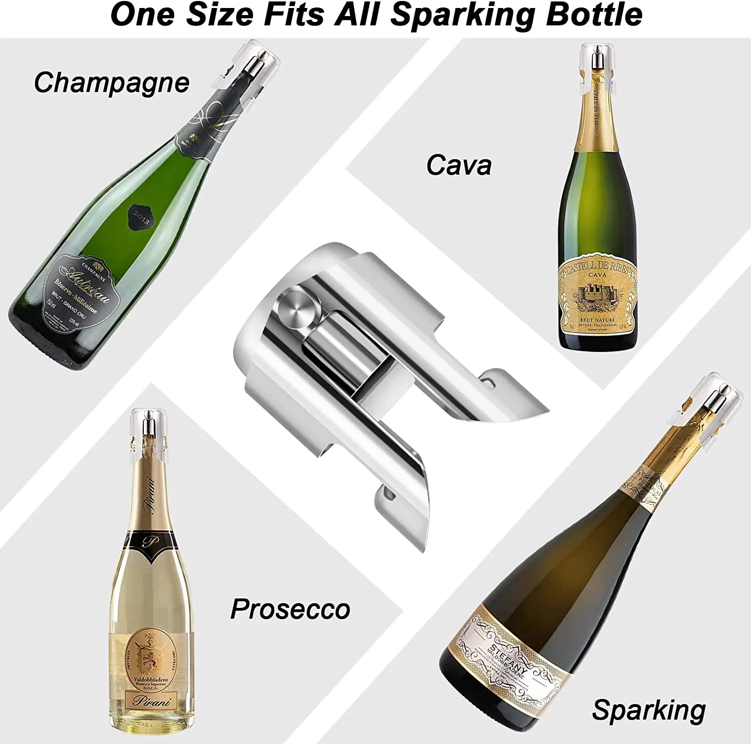 This includes prosecco, cava, some magnum, 187ml bottles, and even several. kloveo champagne stopper, patented seal, no pressure pump. yes, it fits all standard 750ml champagne or sparkling wine bottle necks. champagne stoppers keep the pressure from escaping the opened bottle and keep oxygen out, maintaining both the.